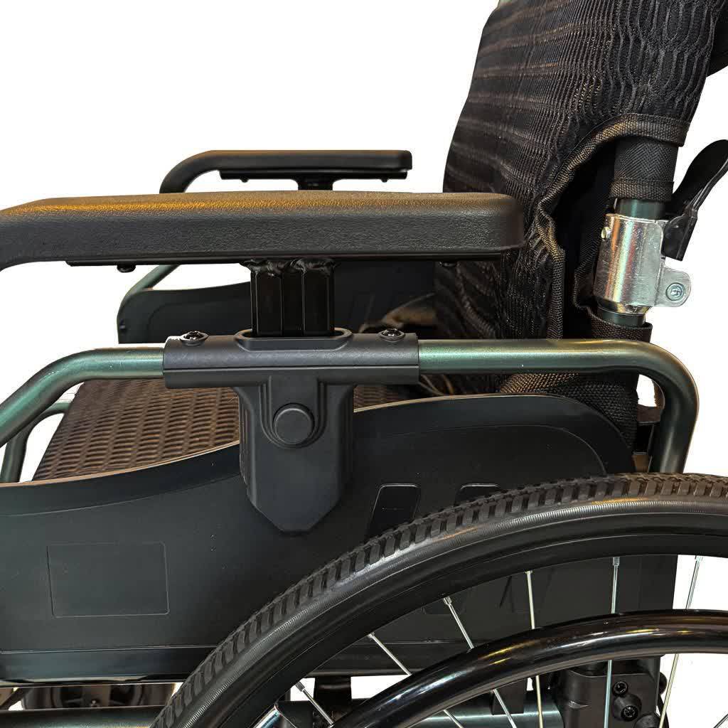 جنس بدنه : آلومینیوم با پوشش رنگ کوره ای /وزن محصول : 16 kg/وزن قابل تحمل : 130 kg/ابعاد با کارتن : 90*28*90 cm/نوع شاسی : لوله ای/زیر دستی : متحرک حالت میز تحریری و قابل تاشدن به پشت ویلچر/زیر پایی : متحرک/چرخ جلو : 50*200 توپر طرح بادی با دوشاخ آلومینیومی/چرخ عقب : اسپرت توپر/کفی و پشتی: برزنتی ارگونومیک /عرض محصول در حالت باز : 64 cm/عرض محصول در حالت بسته : 30 cm/عرض تکیه گاه : 46 cm/قطر چرخ عقب : 60 cm/قطر چرخ جلو : 20 cm/ارتفاع محصول : 89 cm/طول محصول : 104 cm/طول پشتی : 40 cm/طول کفی : 40 cm/سایر مشخصات :طراحی پله ای زیر دستی جهت استفاده از میز غذا یا میز تحریرقابلیت تاشدن جهت حمل و نقل آسان چرخ عقب توپر اسپرت ، دوشاخ جلو آلومینیومی ، کفی زیرپایی پلاستیکی، زیر دستی قابل تنظیم